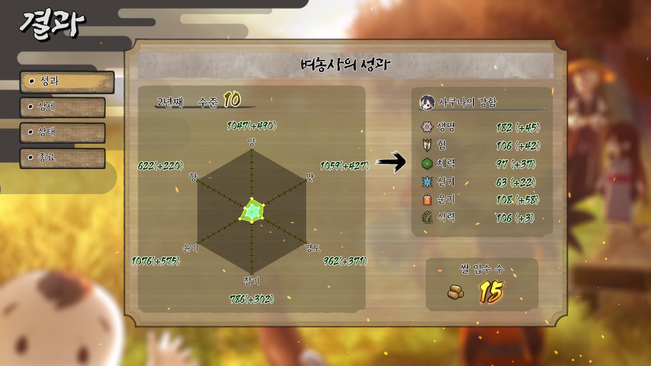 공략이 충분히 풀린 지금 시점에서 재조사한 결과, 농사일은 아무것도 아니고 그저 노가다였습니다. 아주 완전히 망쳐버리지 않는 한 농사 결과는 큰 기복없이 일정한 수준으로 나오며, 매년 능력 성장치가 큰 폭으로 오르기 때문에 진행을 잠시 멈추고 농사일만 몇년 전념하면 게임을 아주 쉽게 풀어나갈 수 있었던 것입니다.