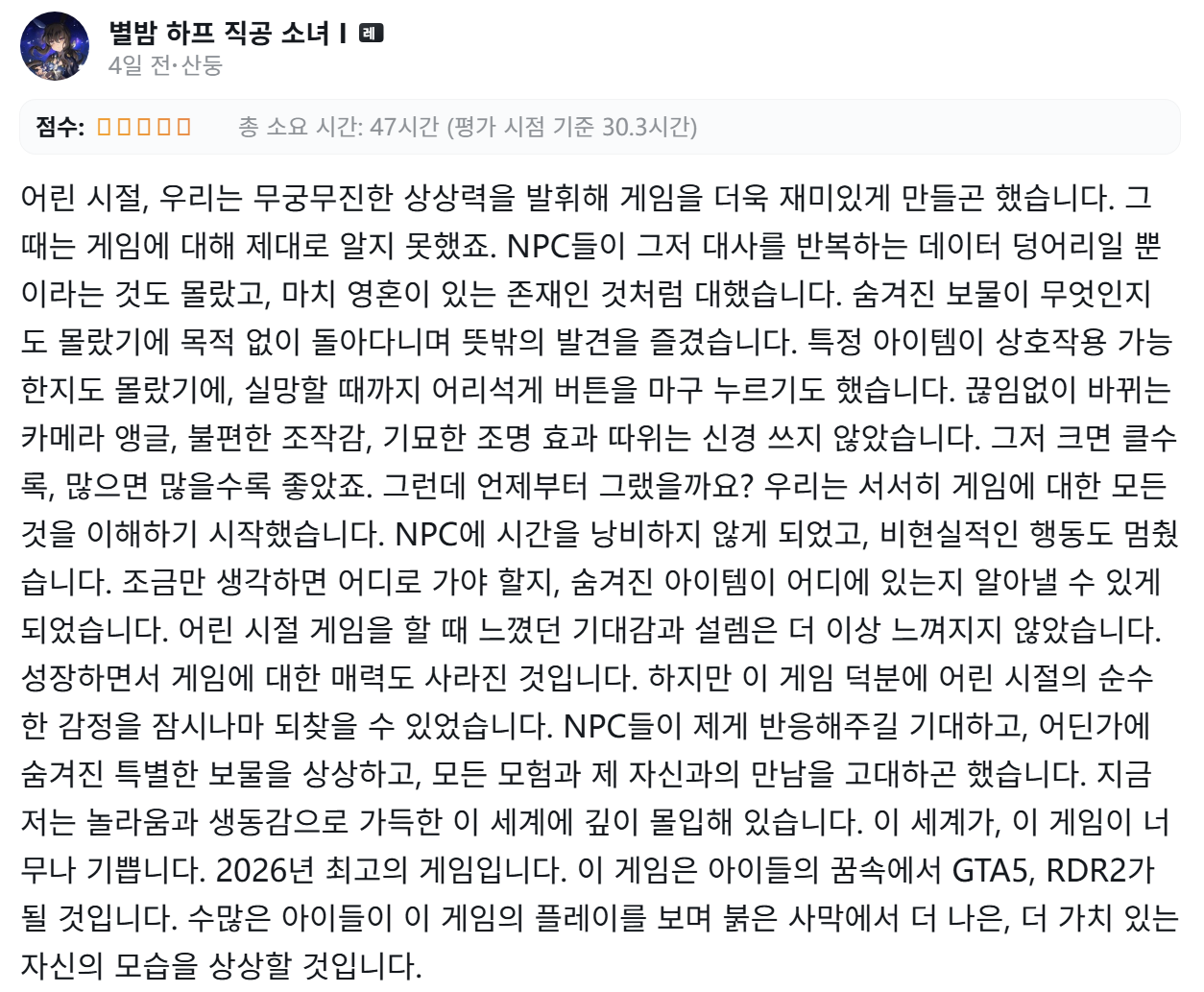 영원한 게임은 영원히 업데이트하는 온라인 게임 뿐입니다. 붉은 사막도 싱글 게임이라서 젤다나 스카이림처럼 언젠가 끝이 보입니다. 저는 이제 막 끝이 보이기 시작해서 슬슬 꿈에서 깨어나는 중입니다. 100시간의 꿈을 8만원 주고 산 셈이니 가성비는 좋습니다.
