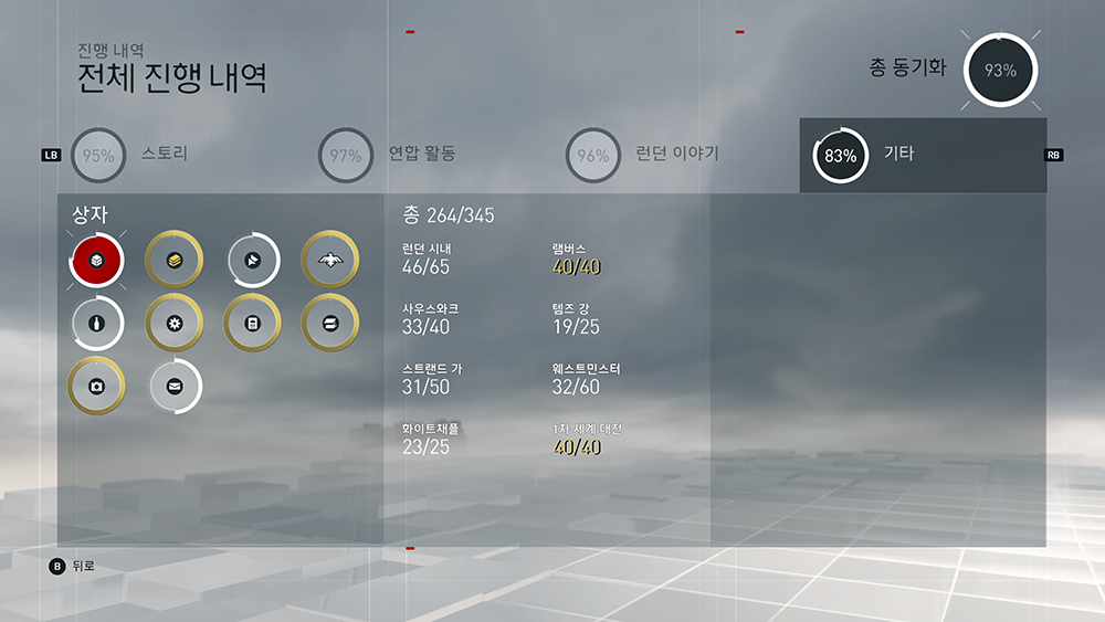 오리진의 바로 전작인 신디케이트를 다시는 플레이 하고싶지 않을 정도로 클리어했습니다. DLC까지 전부 클리어이며, 엄밀히 말하면 트로피까지 완전 클리어는 아니지만 (42/56) 다시는 플레이하지 않을 정도로 싹싹 햩아먹었으므로 개인적인 의미로는 클리어입니다.