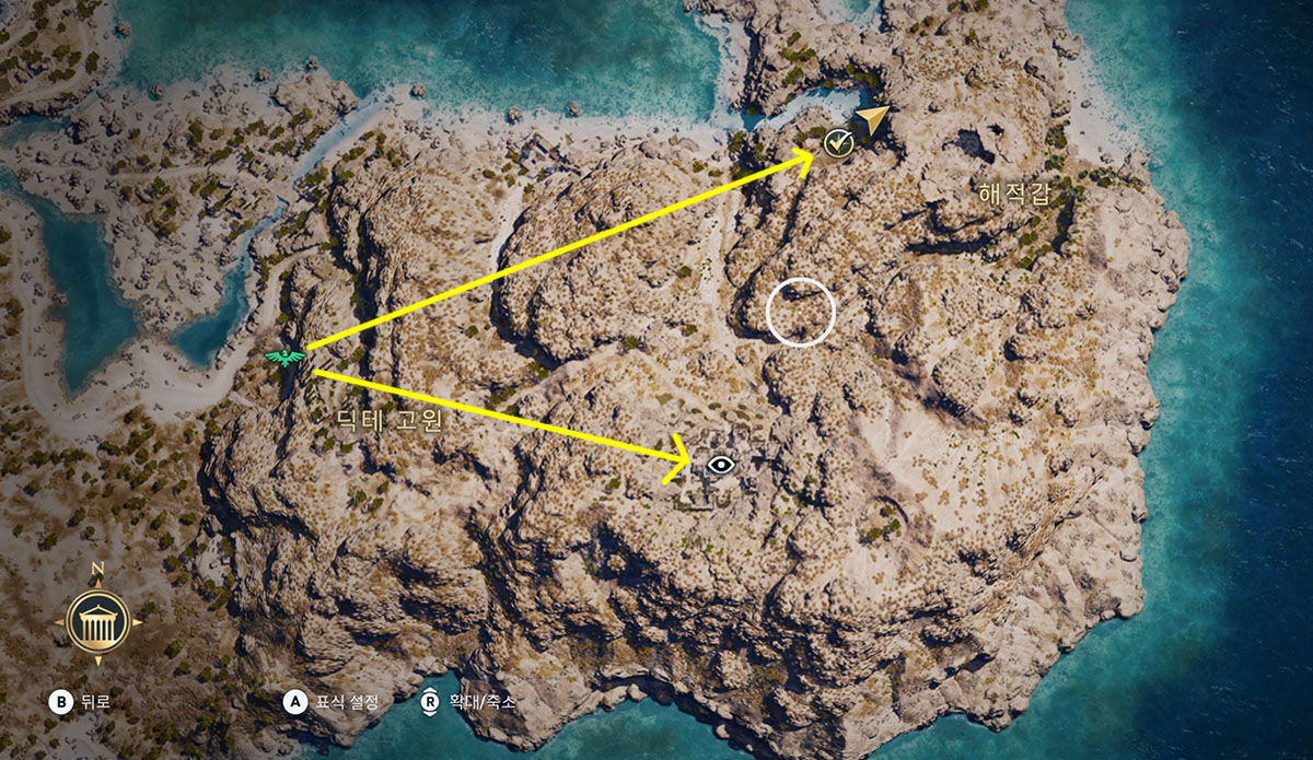 작중 가장 엄한 곳에 위치한 견학 포인트입니다. 보다시피 동기화 포인트가 없는 외딴섬이기 때문에 육로로 가는 법은 전혀 없으며, 근처의 다른 섬에서 쪽배를 타고 2 km 를 항해해야 도달할 수 있습니다. 다행인 건 인게임과는 달리 대양을 항해해도 쪽배가 부서지지 않는 겁니다. 그 고생을 해가며 가면 뭐가 있을까요? 가면 더 허탈해집니다. ㅎㅎ
