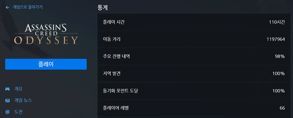본편 클리어에만 66레벨까지 달리면서 무려 110시간을 플레이했습니다. 좀 더 정확한 유비 통계이므로 제가 지금까지 플레이한 스팀판 어크처럼 1.5배 뻥튀기하면 약 170 시간 플레이 했다고 생각하시면 됩니다. 이제 뉴게임+ 모드가 해금되었는데, 지도와 발견한 장소가 전부 리셋되는 걸 보고 2회차는 포기하고 이대로 DLC 까지 끝내기로 했습니다. 당초에는 지금 플레이 시간이면 DLC 까지 전부 클리어 완료할 것으로 예상했는데, 이전과 달라도 너무나도 다른 어크였습니다.