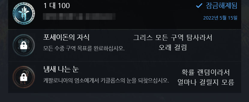 두 게임을 '올클'한 다음, 도전과제와는 상관없는 맵상의 미방문 위치나 무한반복이 아닌 일회성 퀘스트 등을 추가로 깼습니다.이미 게임 컨텐츠 즐길 건 다 즐겼기 때문에 이전처럼 매달리다시피 플레이한 건 아니고, 하루 한시간씩 가볍게 즐겼네요.
