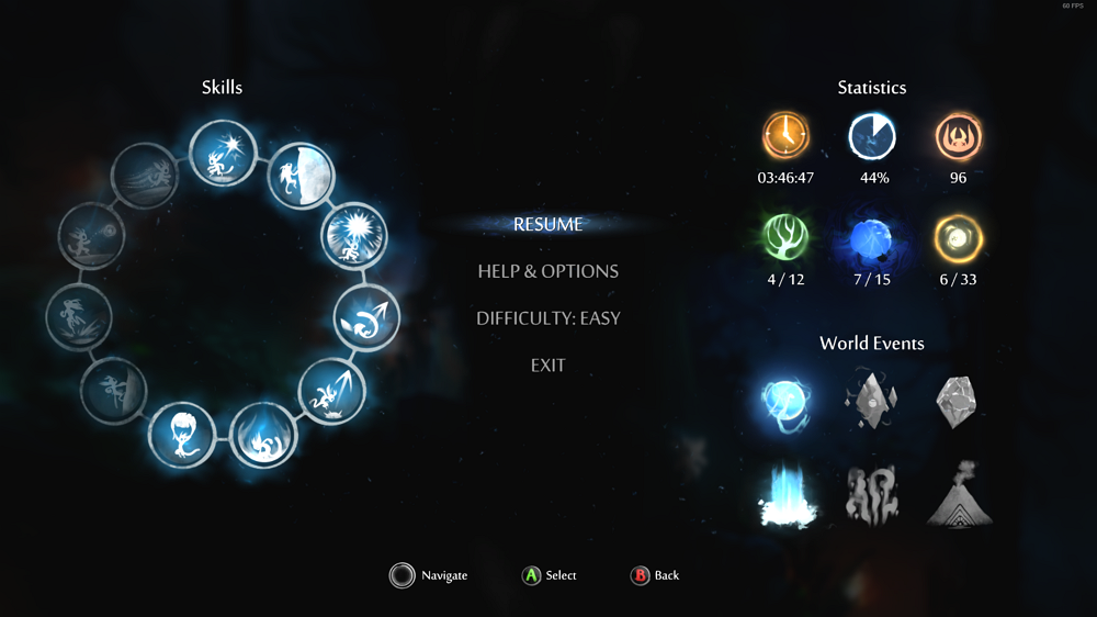 오리숲은 월하의 야상곡과 같은 장르이긴 하나 게임성이 크게 다릅니다. 오리숲을 한마디로 표현하면 "막장 마리오" 의 후계자 플랫포머 게임입니다. 슈퍼마리오처럼 점프 컨트롤이 매우 중요하고 난이도가 높은 마리오 맵처럼 사방에 즉사 함정이 널려 있어서 아주 약간의 실수도 허용하지 않는 종류의 게임입니다. 전투 요소도 있긴 하지만 왠만한 건 점프 트릭으로 해치우거나 넘어갈 수 있어서 공격력 스킬 노가다는 전혀 필요없을 정도죠. 반대로 말하면 플랫포머 게임을 잘 못하는 저 같은 사람은 중간 강제진행 맵에서 50번 정도 죽고 욕설 좀 내뱉어야 겨우 클리어 가능합니다.